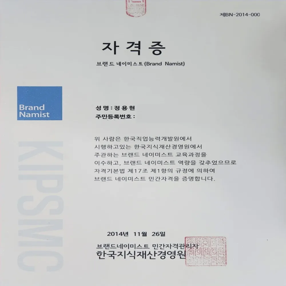※ 브랜드 네이미스트 (Brand Namist) 자격증 보유
