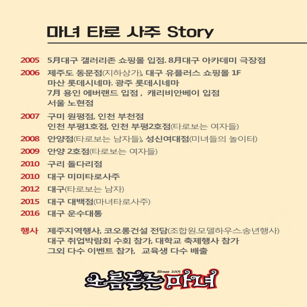 2005년.대구 최초로 동성로 (구)갤러리존쇼핑몰에서 타로사주전문샵 오픈을 시작으로 전국에 20여곳을 직접 오픈 운영한 경험과 20녀년에 걸쳐 수만회의 상담 경험을 가지고 있습니다.