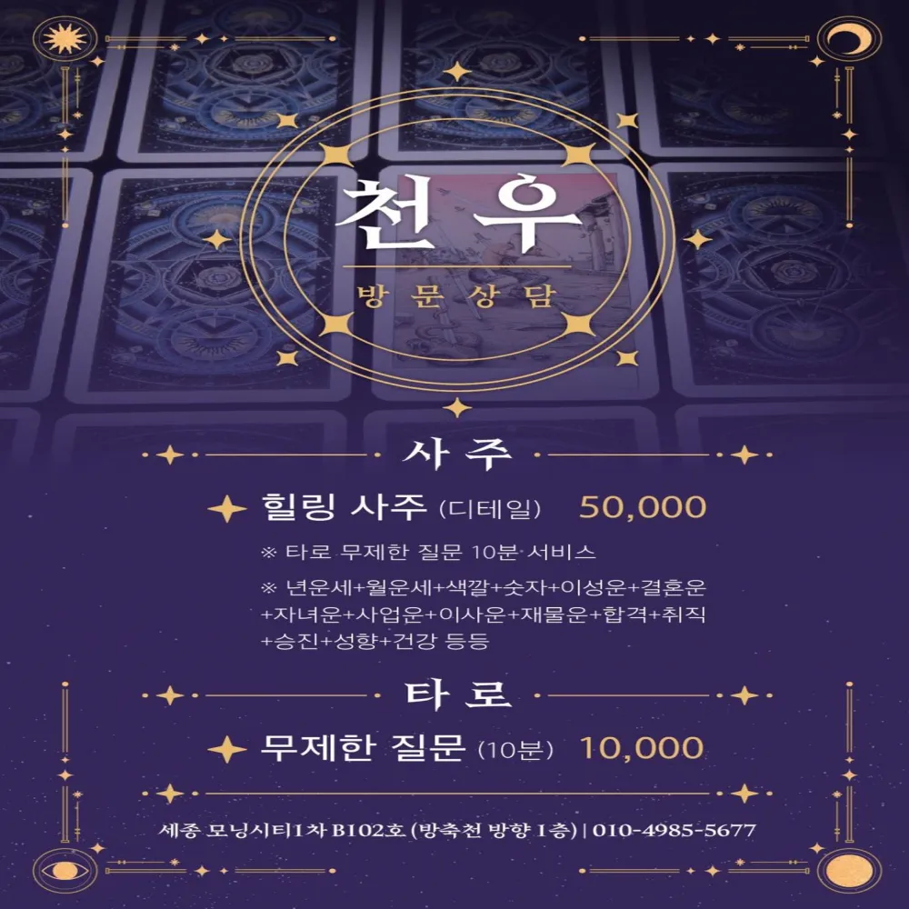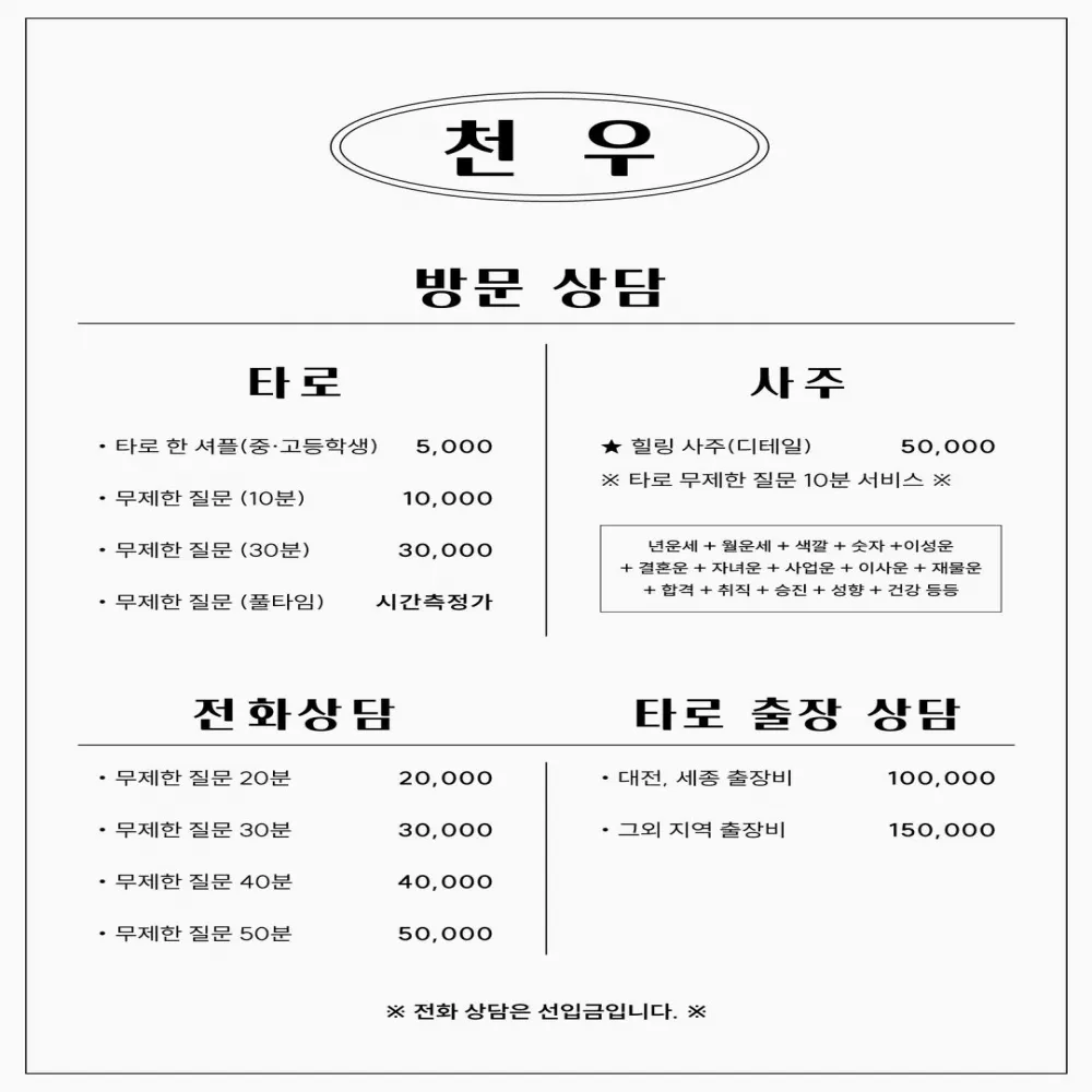 모든 필연적 일은 일어나지 않게 막을 수는 없습니다. 하지만 앞으로의 일에 대비하고, '피할 방법'은 찾을 수 있습니다. 앞길에 무엇이 오고 있는지 피해야 할건 뭔지, 이번 년은 대운이 오고 있는지 궁금하시나요? 고민하고 있는 속마음에 하나하나 공감해드리며 문제점과 해결책과 더불어 인생의 기회를 찾아드립니다.