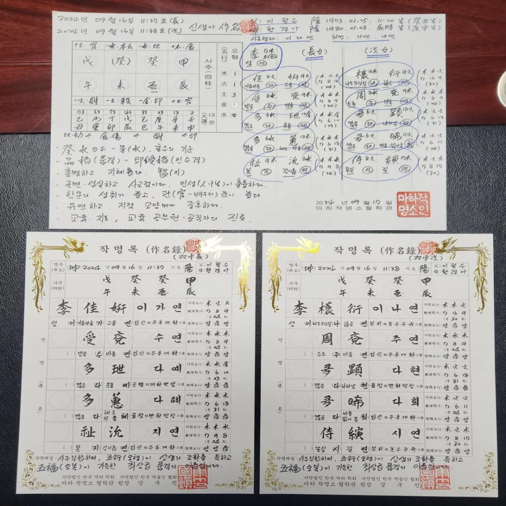 2.사주에 부합하고 오행이 상생의 조화를 이루며 4격 수리획수의 품격이 최상급인 좋은 이름 5개를 작명록에 써서 이름의 뜻과 의미를 설명해드립니다